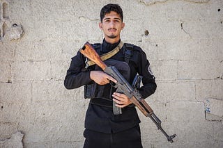 DAMASCUS — The midday sun blazes down on the ruins of Jobar on the outskirts of Damascus, where Zakaria walks through the wreckage, weapon over his…
